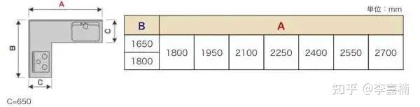 图中C为两边的操作台进深,均为650mm。当然如果条件不允许,做到550mm也是可能的。顺便说一下一般的布置顺序是:冰箱→水池→操作灶台,对应了一系列过程:从冰箱取菜→洗→切→炒。
