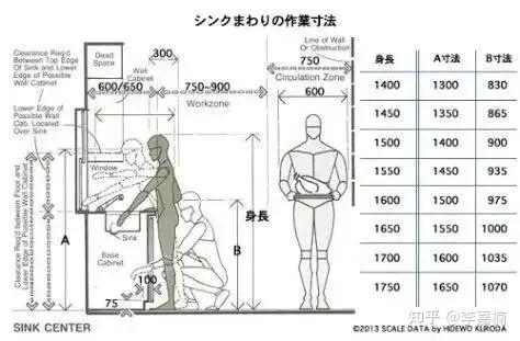 下图给出了部分身高的参照。水池的高度大约在尺寸B以下100mm左右为宜。