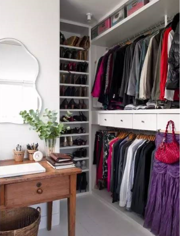 开放式衣架也是板式衣柜的一种,只是省去了柜门,或者刻意用布帘做门。这种没有门的小衣架,适合租住房子或者希望把家里营造得格外超凡脱俗的你使用。