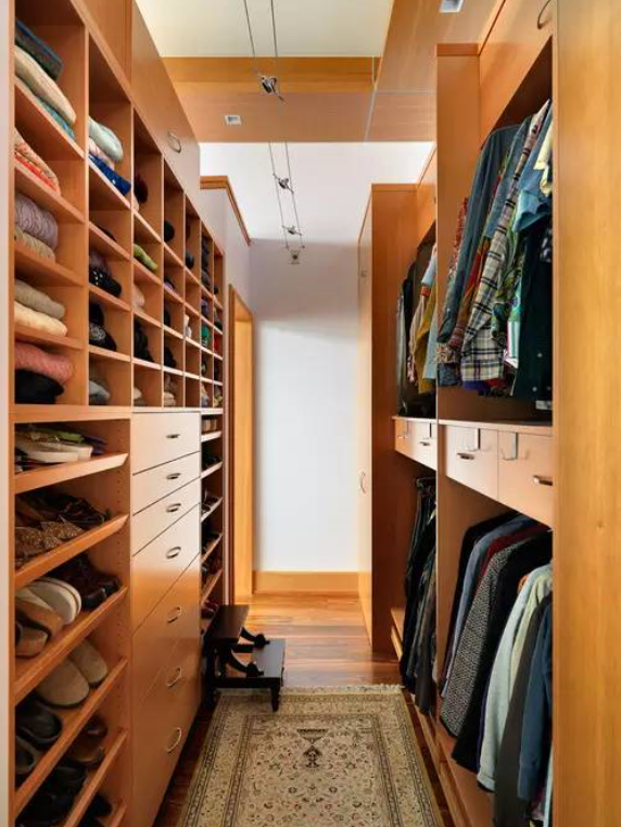 衣帽间的重点跟衣柜类似:通顶还是不通顶、有门还是没有门,所用五金是什么(比如铰链是不是用Blum或者Hettich)。但相对来说,因为格子多,根据主人的生活习惯进行设计,就更为重要。如下,我们列举一些常见的衣帽间(也包括衣柜)分区结构图,你可以根据自己的衣物使用频率、取放习惯,跟将来的衣柜设计师商量着设计自己的衣帽间或者衣柜,希望以后有机会,我们还能结合收纳,再详细写写布局问题(之前也写过一次,点这里