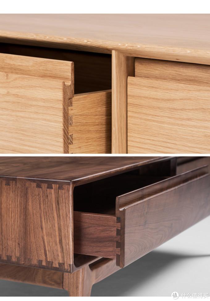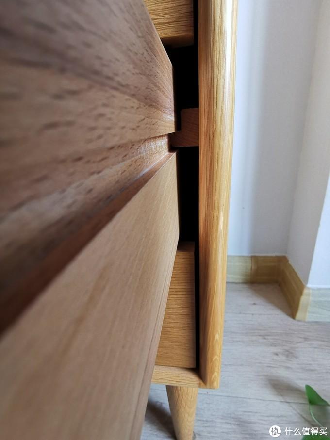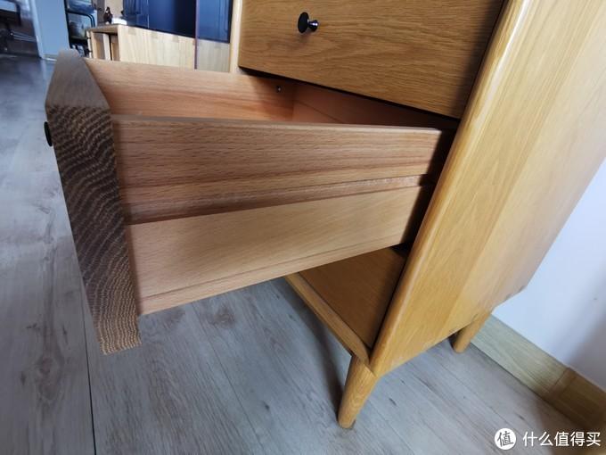 这里顺便要提到一点,许多网售家具在抽屉处开槽,使用木轨道,宣称使用寿命较长,不用担心金属滑轨的的锈蚀等问题,且经过长期使用摩擦后可以越用越滑,抽拉手感也比金属轨道要好。