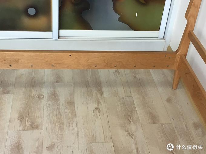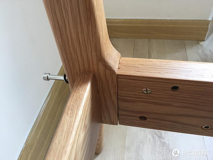 床侧板与床头、床位连接结构是靠两颗螺丝固定,侧板上有卡扣,坐到两颗螺丝上,将螺丝拧紧即可固定,这也是很多低价位的床的常见固定方式。