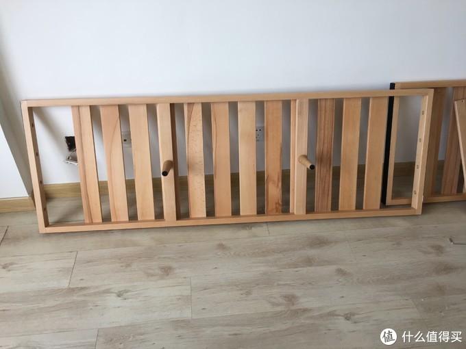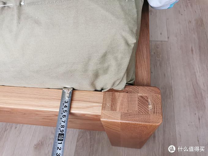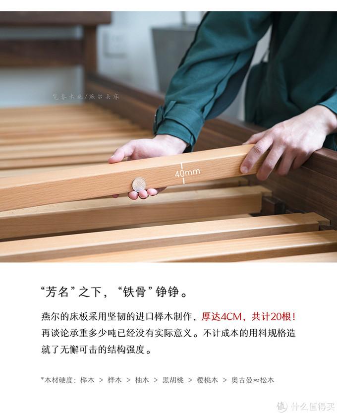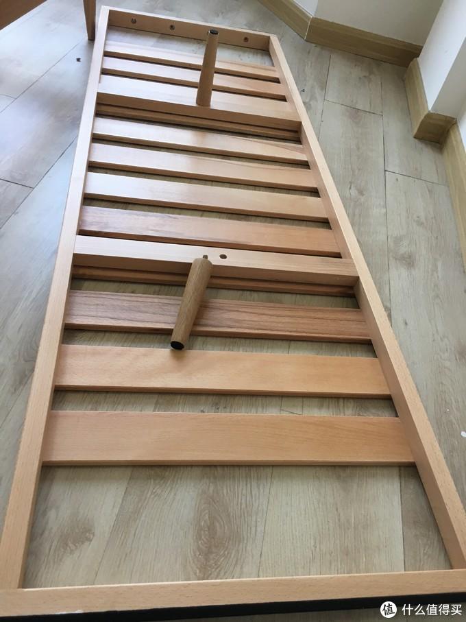 这张床红橡主材,松木铺板。松木铺板未涂装,略微有些松香味,但是气味不大,散了几天味道也就淡了。可以看到床侧板、尾板、床头板均为2cm厚的标准板材,床中央有一根承重“梁”,也是2cm的木条,木条中央有一根床腿支撑。床腿厚度为4cm,为两层标准板材胶合而成。床头板高度较矮,不是很大气。