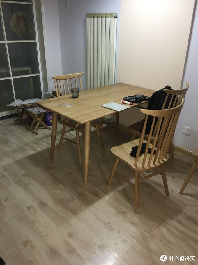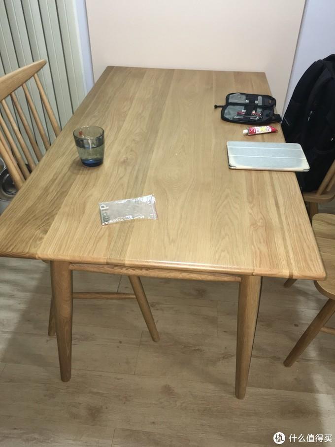 餐桌买的是浮生记店里的餐桌,2018年5月入手,价格1680元,纯白橡材质,尺寸140cm*80cm*75cm。