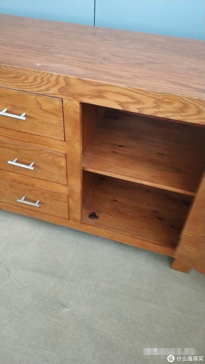 全柜整装发货,140cm*42cm,高度忘了,100%纯白橡材质,无辅料无指接板,属于青岛家具厂子的样品。放的时间长了有点显得旧,不过木料还是不错的。整体柜子用料比较扎实,但是并非榫卯结构。我看过柜子内部,也是用螺丝固定的。