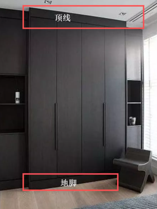 厂家为了防止量房尺寸会有误差(一般误差会在1公分之内),就预备了封板这个东西,包括柜体上面会有一个顶线,下面有地脚。