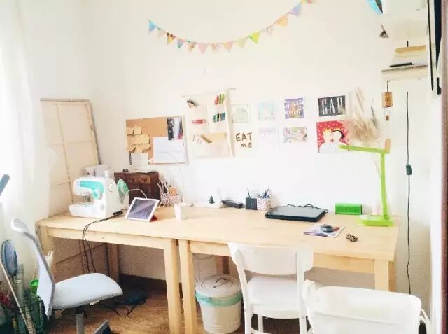 工作区放置两张充满天然木质感的餐桌作为办公桌,两人在一起也能拥有独立的空间,互不干扰。墙上挂上留言板和贴画装饰,明亮的空间也助于效率的提高和灵感的迸发!