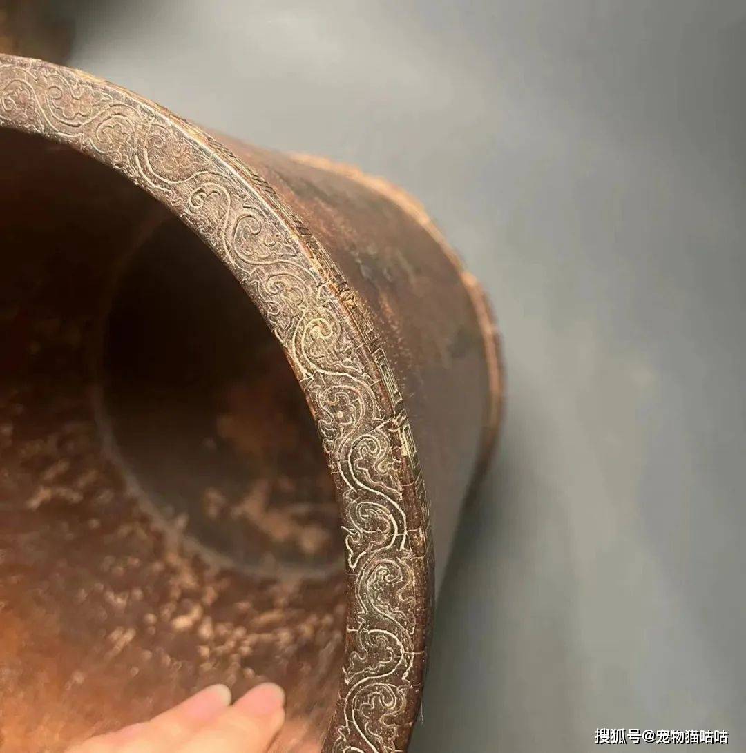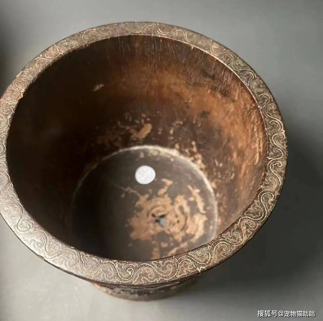 口沿顶部嵌银丝为缠枝蔓,口沿立面则以银丝嵌一周回纹。