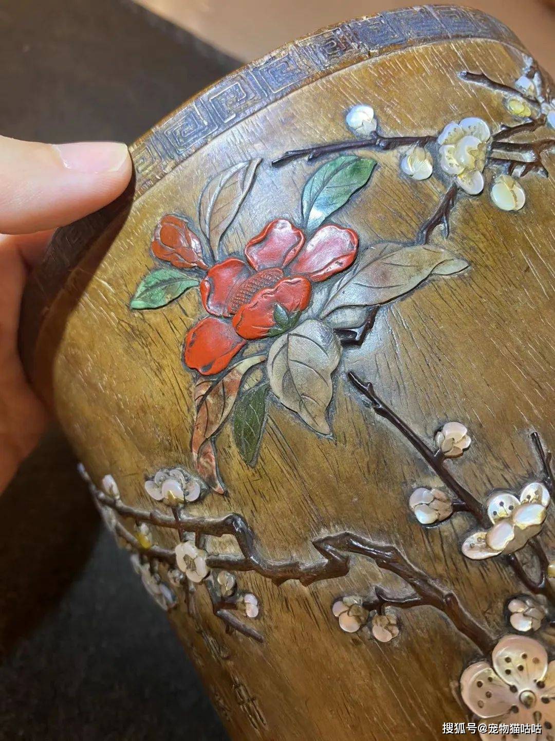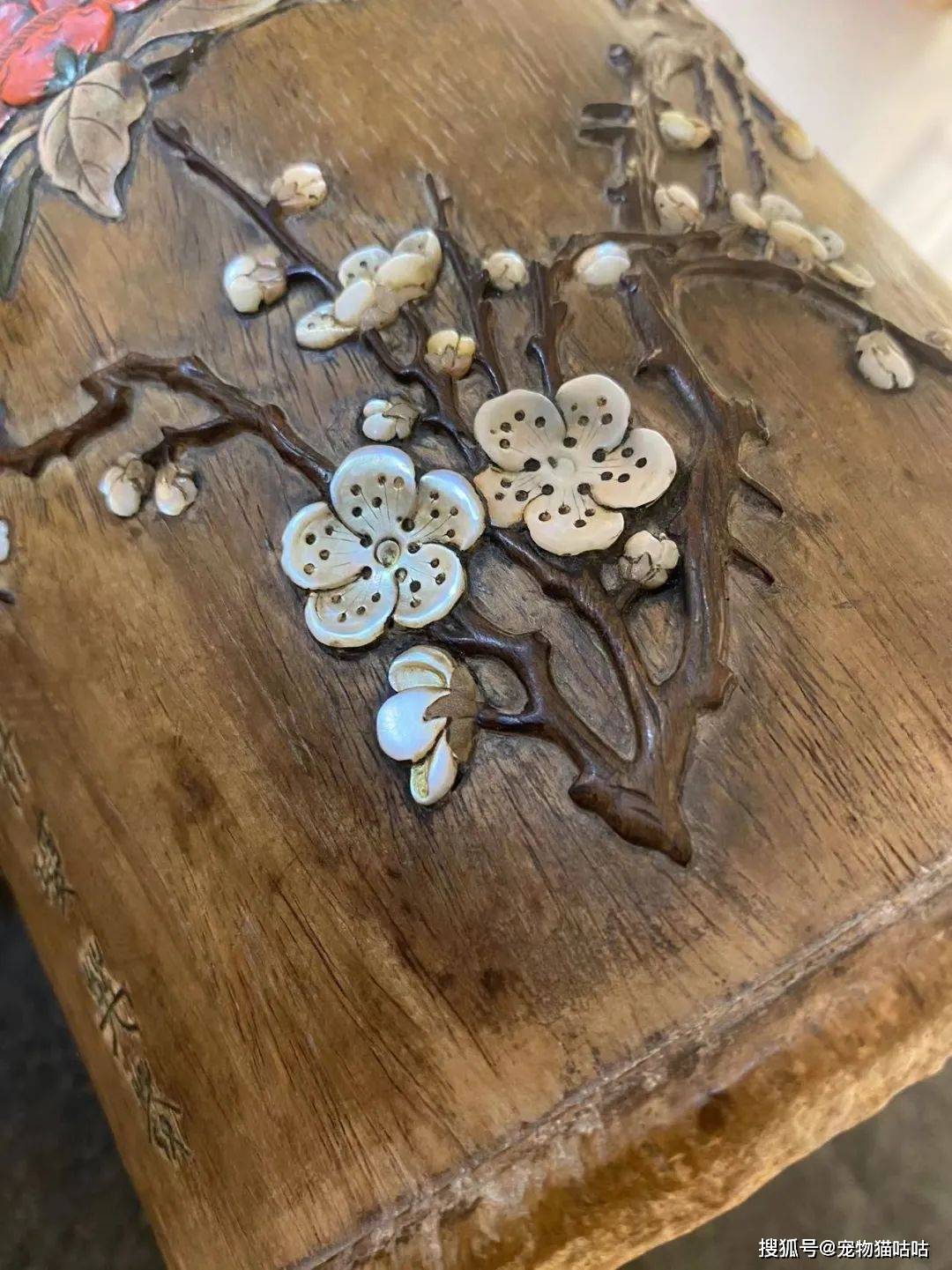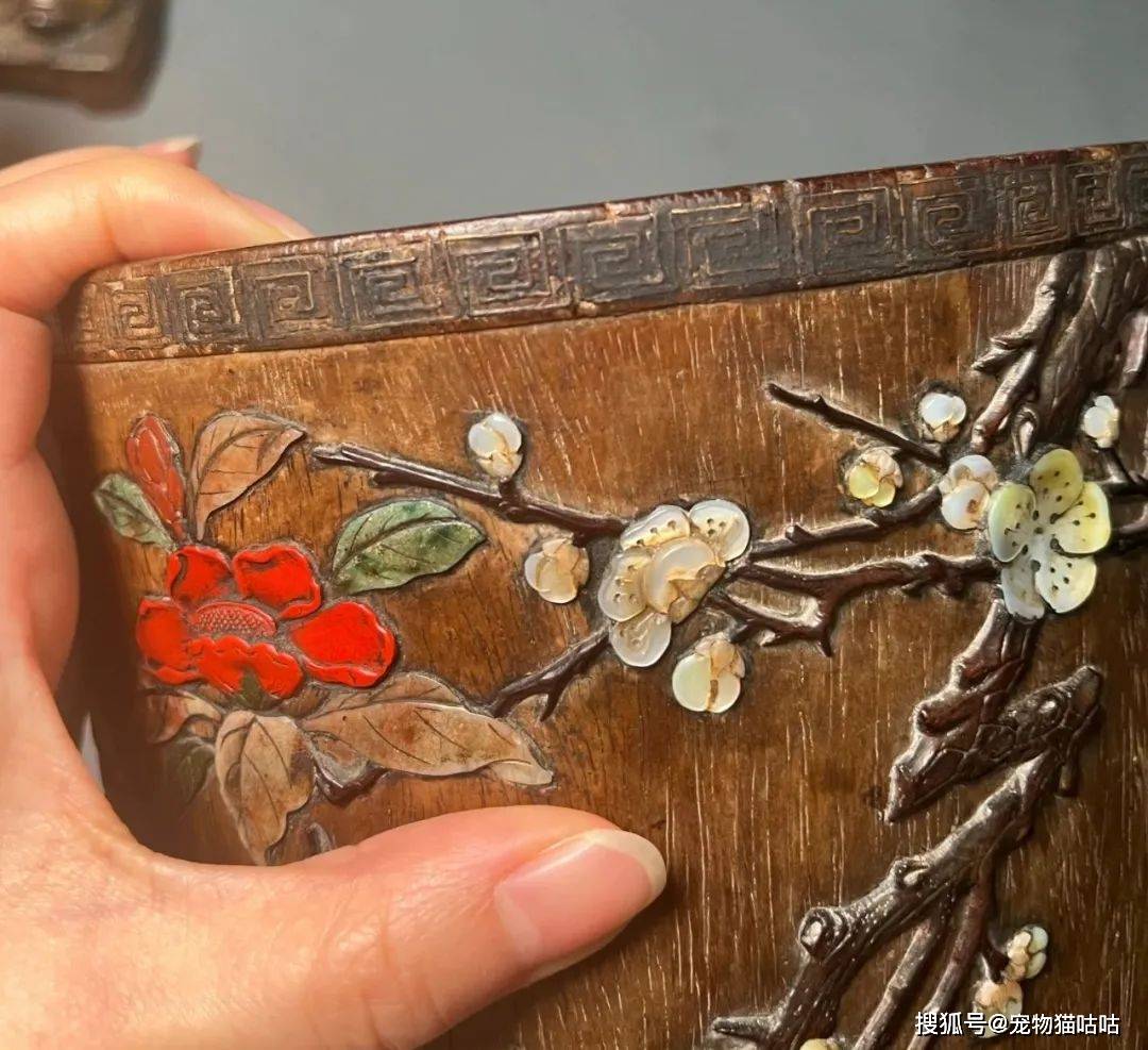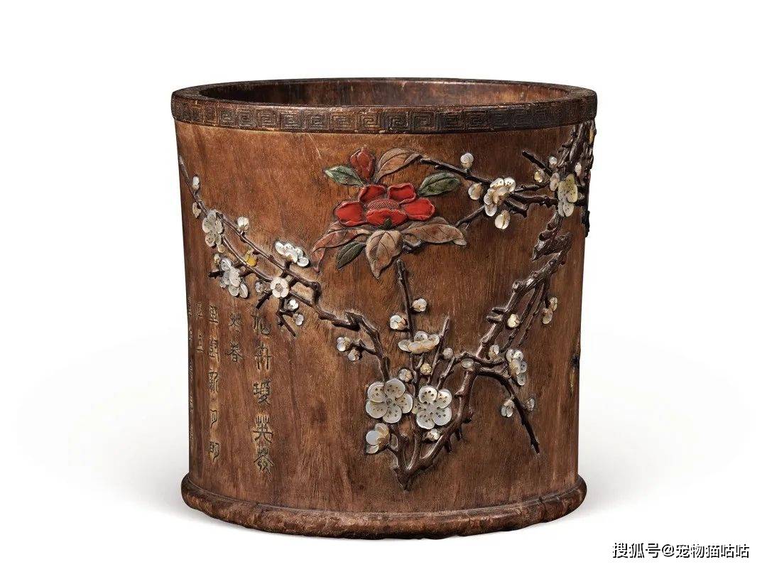 嘉德春拍上的这件笔筒,所见梅花与海棠的组合镶嵌曾在一件牧心斋旧藏的周翥制紫檀百宝嵌烹茶图提盒上见到,或为制作者的一种偏好。
