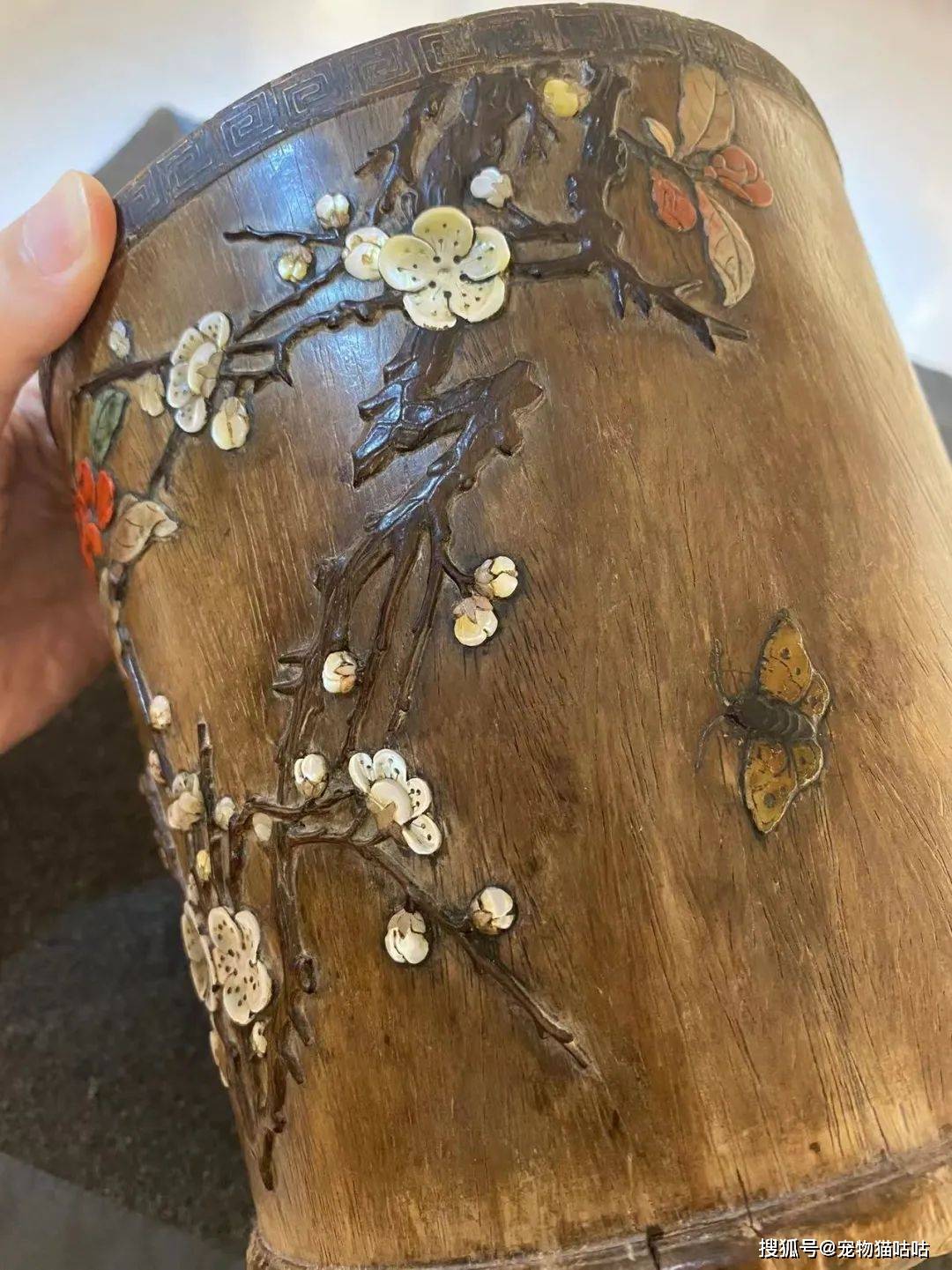 黄花梨之作的大笔筒,原皮壳,外壁以螺钿、玉石、百宝嵌饰梅花、山茶、蝴蝶,镶嵌入木三分。