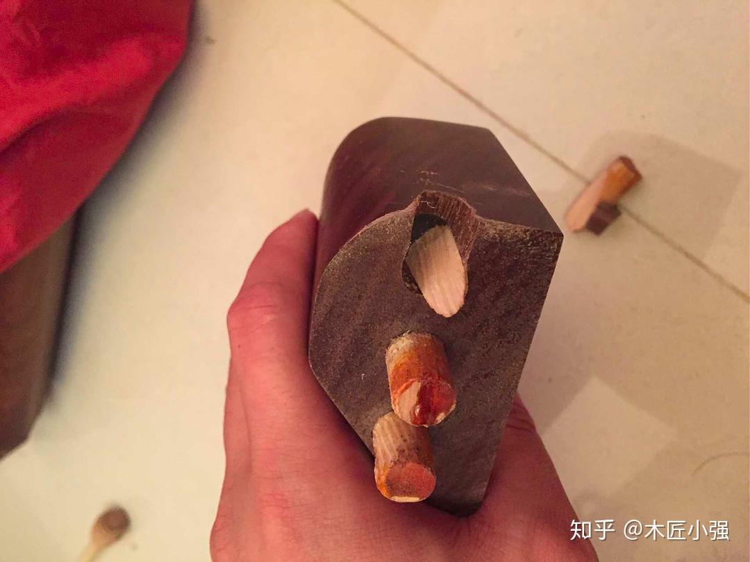 注意下图榫卯见的小圆点,看起来这个圆点毫无存在理由,既不美观又多此一举。然饿,这个地方可能是个关键,就是上面的小圆木,是为了遮挡小圆木塞下面的螺丝,因为如此直拼交接榫卯,总体还是不太牢靠的。那么螺丝干嘛用呢?省工