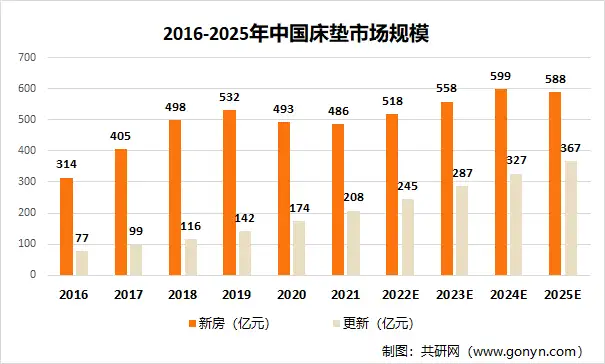我国家居市场主流的床垫种类繁多,有弹簧床垫、乳胶床垫、记忆棉床垫、空气床垫、棕榈床垫以及混合床垫等。随着物质文明和技术工艺的不断进步,现代人们使用的床垫种类逐渐趋向多元化,床垫需求持续增长。