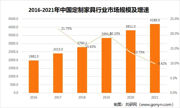 随着人们对生活的享受,对美的追求,各类定制发展起来。定制家具行业市场规模也逐年增加,其中2021年中国定制家具行业市场规模约为4189亿元,同比增长9.9%。
