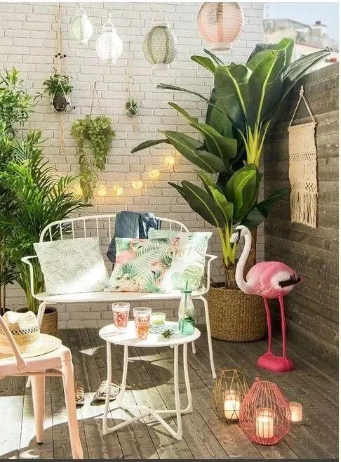 或者用百搭的白色墙壁,户外阳台加一些大型绿植和粉白色家具,每次坐下来喝茶都觉得在热带雨林度假:
