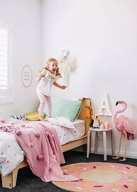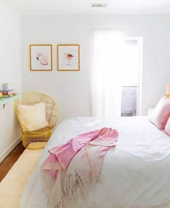 像这种大白墙,加一把金色椅子,用粉色床品,墙上加一副火烈鸟挂画简直点睛之笔: