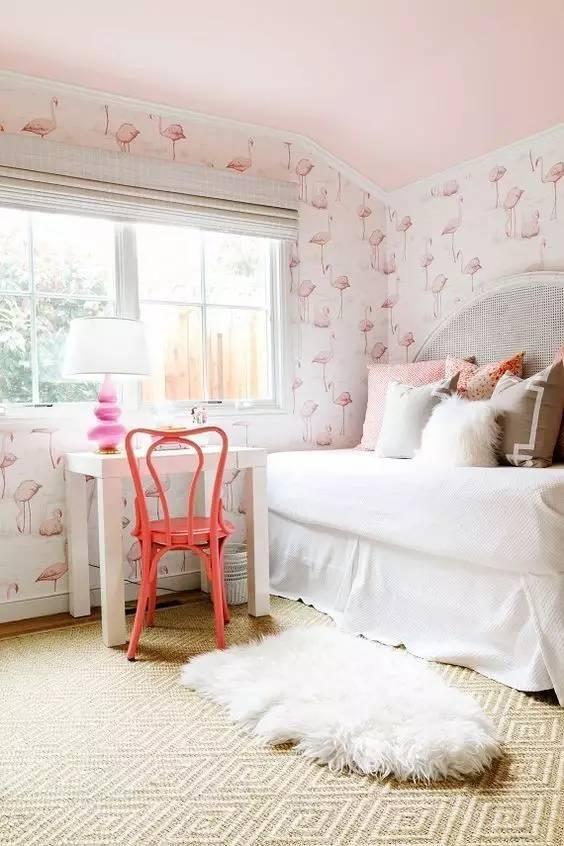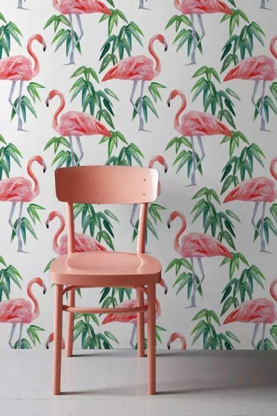 而且白墙+红色火烈鸟墙纸,一定要用粉色椅子才好看: