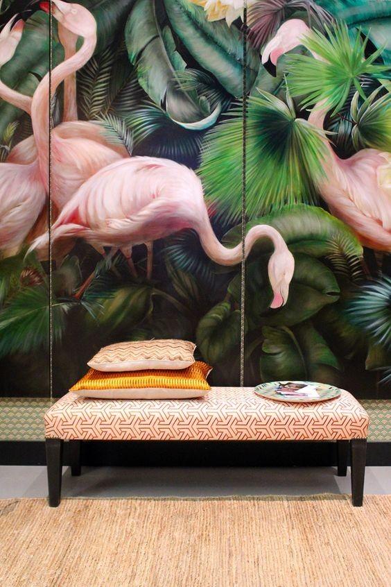 也可以尝试在深色房间里贴绿色植物+火烈鸟壁纸,比较有热带气息,看了就觉得惬意: