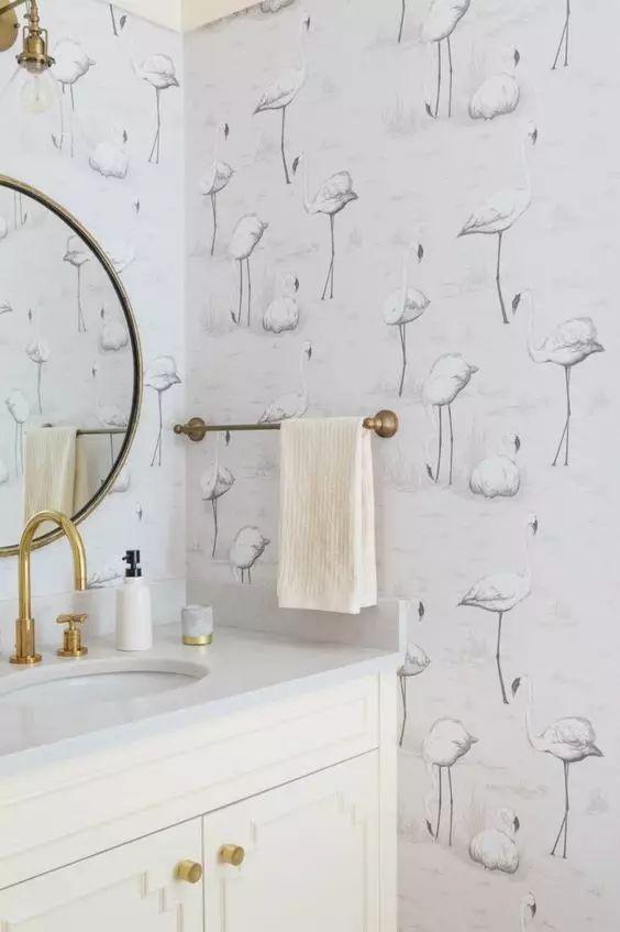 浴室也是火烈鸟墙纸盛行之地,这种绿色+粉红色火烈鸟就很复古: