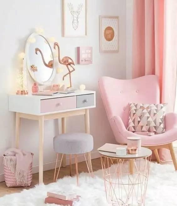 如果是金色的黄铜火烈鸟摆件,白色墙壁和淡粉色家具比较适合,浪漫氛围弥漫开来: