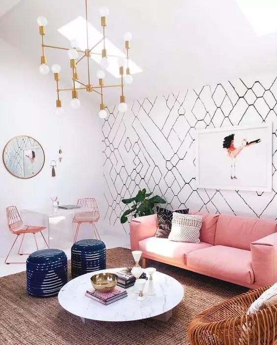 同样的白墙+粉色家具+黄铜灯具,展翅飞翔瞬间就有了不一样的火烈鸟啊: