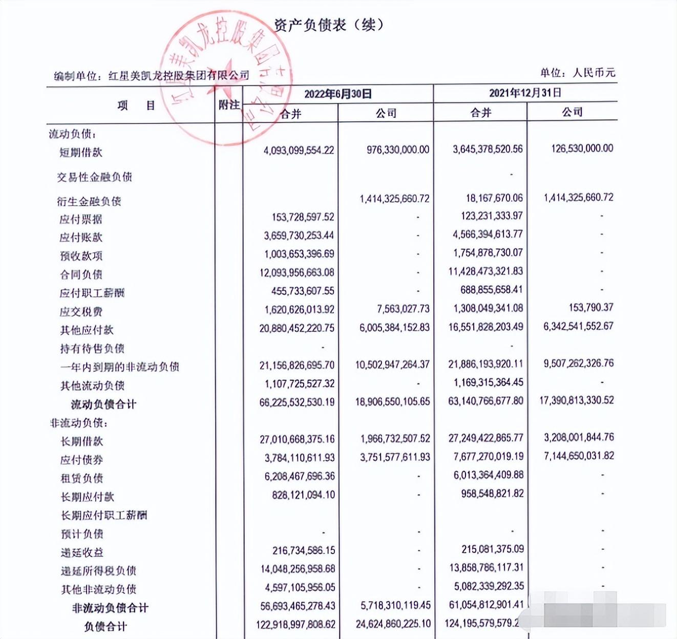 2019年-2021年,红星控股的负债总额为1680.96亿元、1966.06亿元、1241.96亿元。2022年上半年,红星控股总负债达1229.18亿。其中一年内到期的负债662.25亿元,而账上货币资金却只有87.56亿。