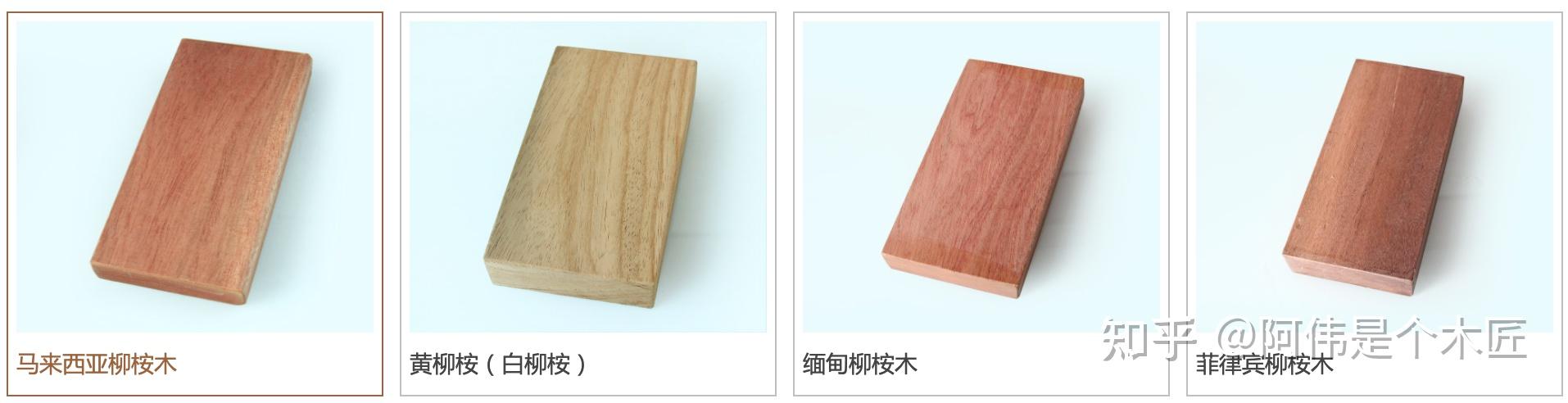 紫檀属:檀香紫檀(印度)(小叶紫檀,印度小叶檀)、安达曼紫檀(印度、安达曼群岛)、刺猬紫檀(热带非洲)、印度紫檀、大果紫檀(缅甸、泰国、老挝)(缅甸花梨、东南亚花梨)、囊状紫檀(印度、斯里兰卡)黄檀属:降香黄檀(中国海南)(海南黄花梨)、越南黄花梨(越南香枝)、阔叶黄檀(印度、印尼的爪哇)(印尼黑酸枝、油酸枝、印度紫花梨)、卢氏黑黄檀(马达加斯加)(马达加斯加黑酸枝、大叶檀)、东非黑黄檀(非洲东部)、巴西黑黄檀(巴西)、亚马逊黄檀(巴西)、伯利兹黄檀(中美洲伯利兹)、紫酸枝(柬埔寨红酸枝)赛州黄檀(巴西)、交趾黄檀(越南、泰国、柬埔寨)(柬埔寨红酸枝、老挝红酸枝、泰国红酸枝)、绒毛黄檀(巴西、中美洲黄檀(墨西哥及南美洲)、奥氏黄檀(缅甸、泰国、老挝)(白酸枝)、微凹黄檀(中美洲)。柿树属:乌木(斯里兰卡及印度南部)(黑檀)、 厚瓣乌木(热带西非)、毛药乌木(菲律宾)、苏拉威西乌木(印尼苏拉威西岛)(印尼黑檀、苏拉威西黑檀)、菲律宾乌木(菲律宾)(印尼黑檀、加里曼丹黑檀)。崖豆属:也叫鸡翅木,非洲崖豆木(非洲刚果盆地)、白花崖豆木(缅甸、泰国)铁刀木属:铁刀木(东南亚、中国云南、广东引种栽培)1.2 缅甸柚木