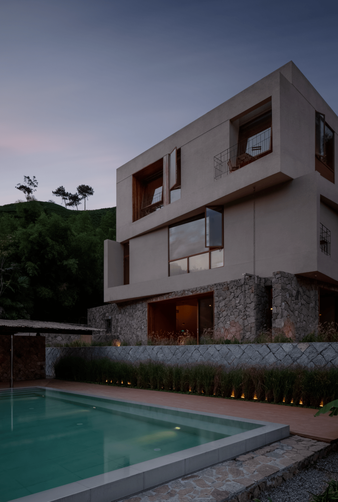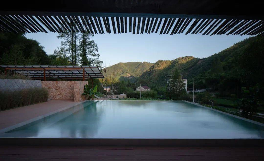叠峦山影,竹林摇动,无遮挡的 天蓝色的泳池,将视野无限拉伸,也将度假感无限延长。