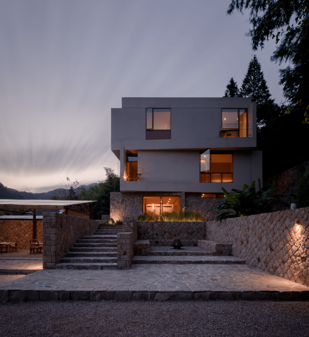 独特的立方体建筑在山野间格外亮眼,夯土肌理又像是自然生长般融洽。