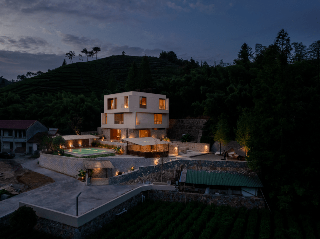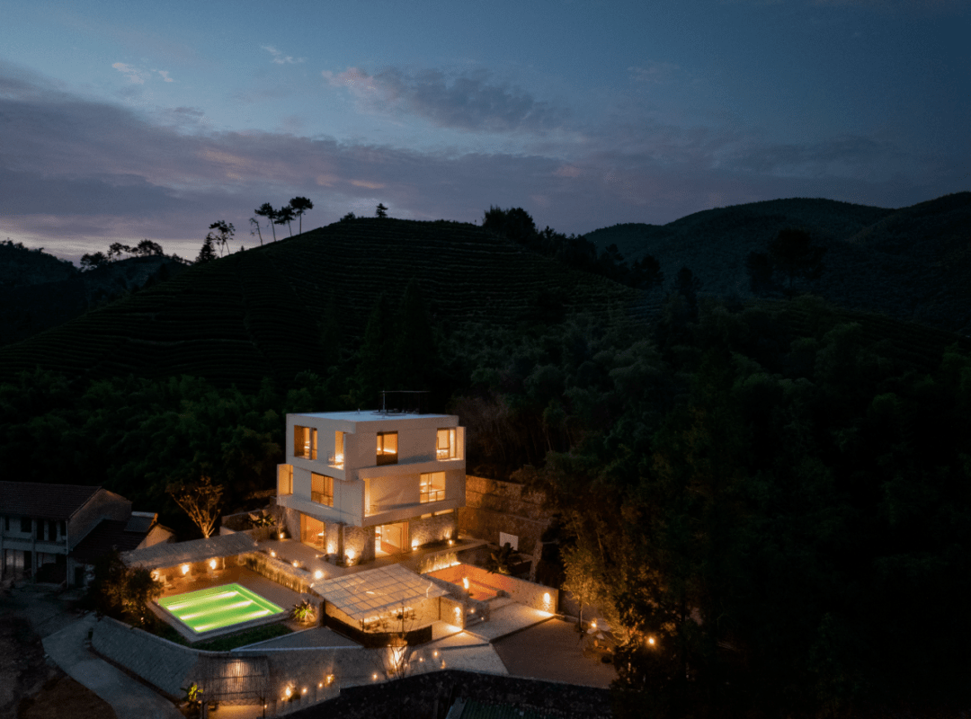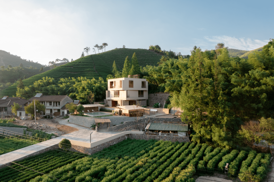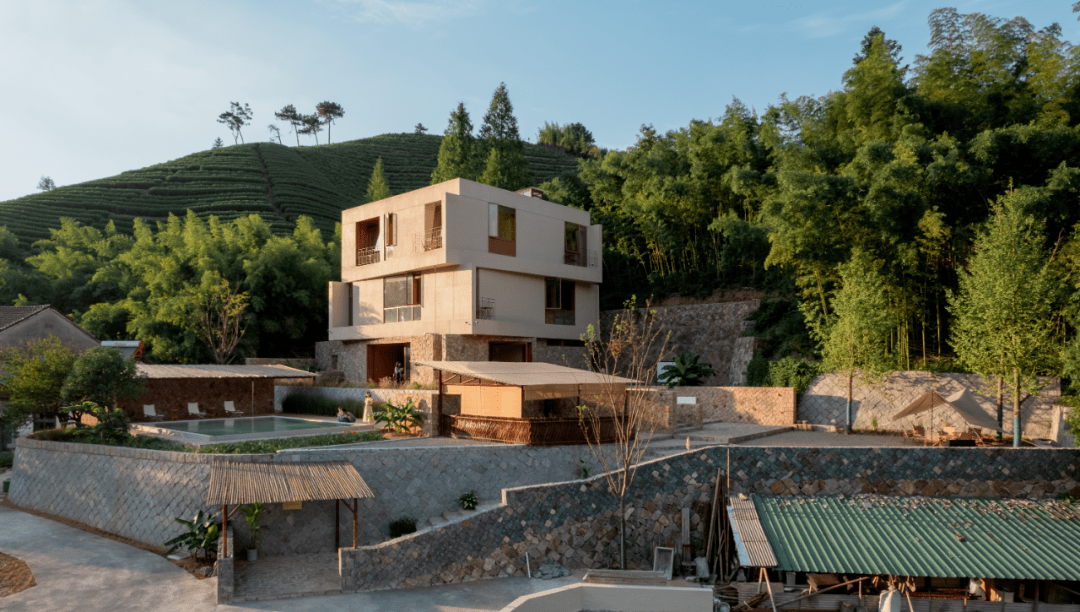 民宿直面茶田竹海,山峦绿林环绕,正方形的建筑外观格外惹眼。