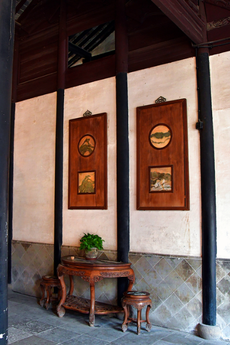 整个厅堂是典型的“前厅后堂”建筑格局,前后楼屋之间均由过街楼和过道阁连接,形成一个环通的走马楼,为同类建筑物所罕见。