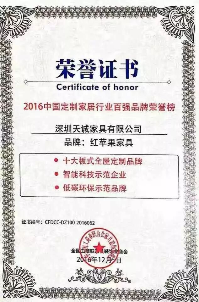 红苹果家具荣获多项奖项:“十大板式全屋定制品牌"、“智能科技示范企业"、“2016中国定制家居百强品牌”、“低碳环保示范品牌”