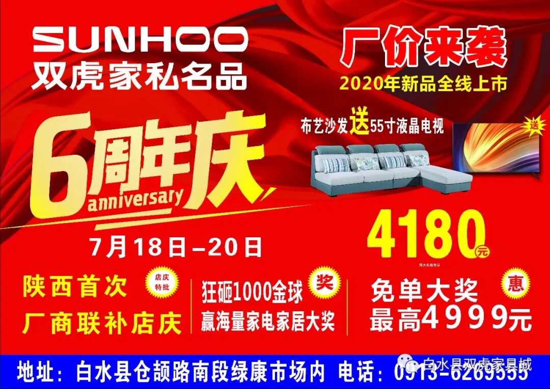 白水双虎家私6周年庆活动已经开始了,年度盛宴,全场所有商品,享受厂家直补价,建店历史最低!4180元购布艺沙发还送55寸液晶电视哦,数量有限,机会难得。