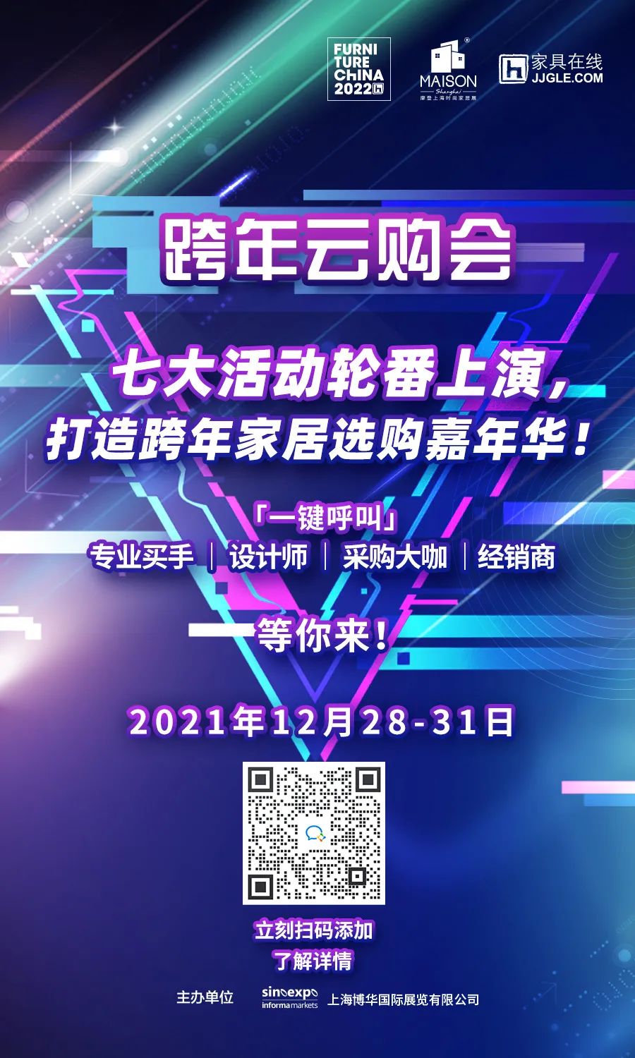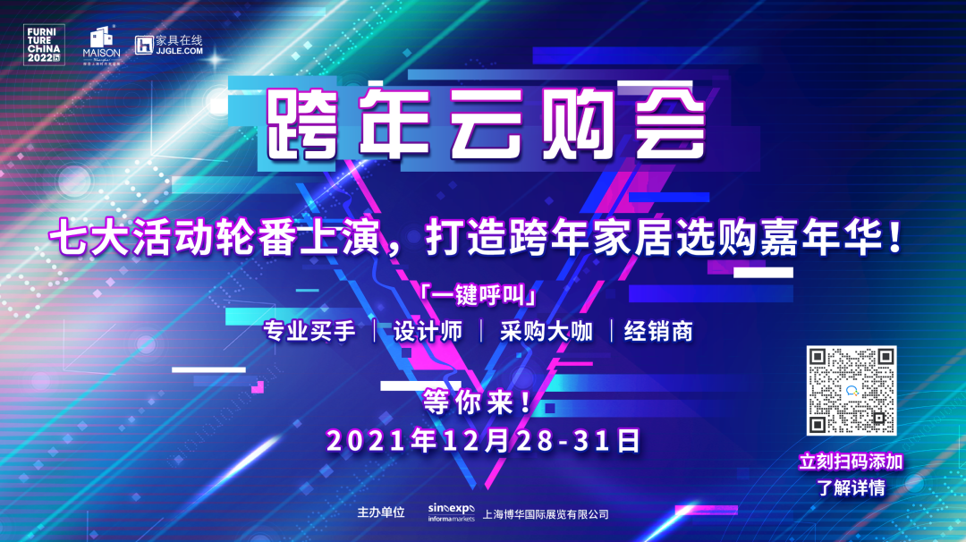 目前“找货小助手”已经征集1,200条真实采购需求,买家采购需求约 140,050,000 元。涵盖大批量外贸采购、公司集采、品牌经销代理、工程项目单、展厅采购、房地产楼盘团购、家具买手挑货、家装设计需求等,为买家与参展供应商穿针引线,助力双方大幅提升交易效率! 看点五 年底清仓,批发零售两相宜没有一件家具,愿意待在仓库过年。“万市大集——缤纷年末狂欢购”携手NS furniture、奇鹿家具、日寸间设计、陆家居、新特丽、凯高、锦地坊、艾布之家等40+ 知名家具企业汇聚于此,在有赞小程序等平台一次放送近 500 款优质家具家居产品,工厂直供,多库存,好货直击低价,清仓甩销,为观众提供了线上底价购入新年家居的机会,助力卖家年底清空库存好物,展望新的一年。2021-2022寻找家居行业变革的力量,汇聚全球家居人的目光,中国国际家具展跨年云购会,七大活动,五大看点,家居行业携手一起,迎接新的一年。