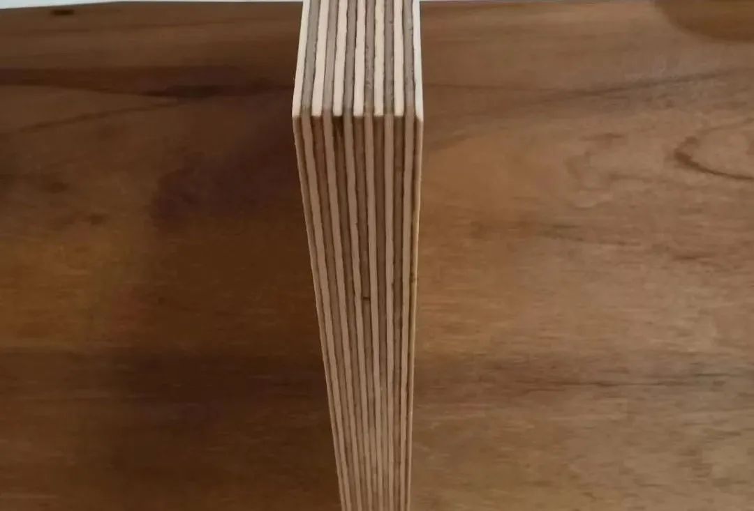 多层板的结构是把实木原材切成1mm左右薄薄的,然后再用胶水贴合在一起,截面很像威化饼。