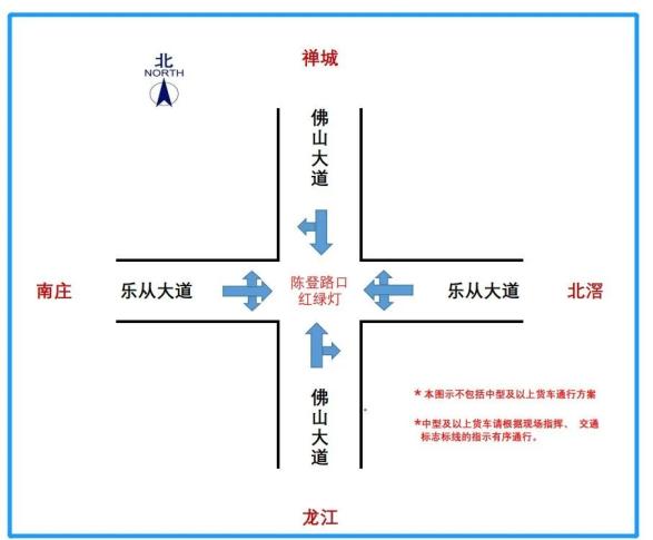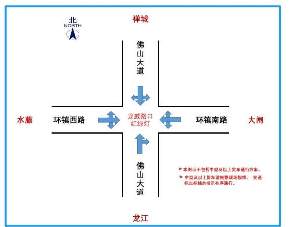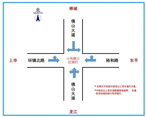 佛山大道南小布村工商业大道路口,北往南方向禁止直行(下沉隧道北往南方向封闭),东往西方向禁止左转,西往东方向禁止右转。