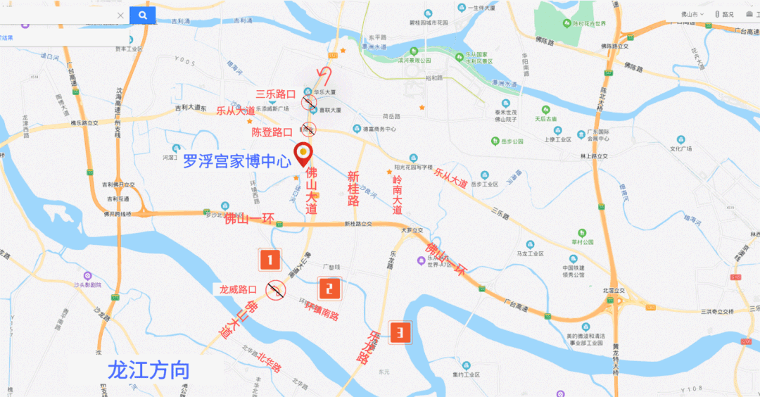 ①龙江二桥—佛山大道(乐从段)—三乐路口往北走几百米掉头(届时开设掉头口)—佛山大道—罗浮宫
