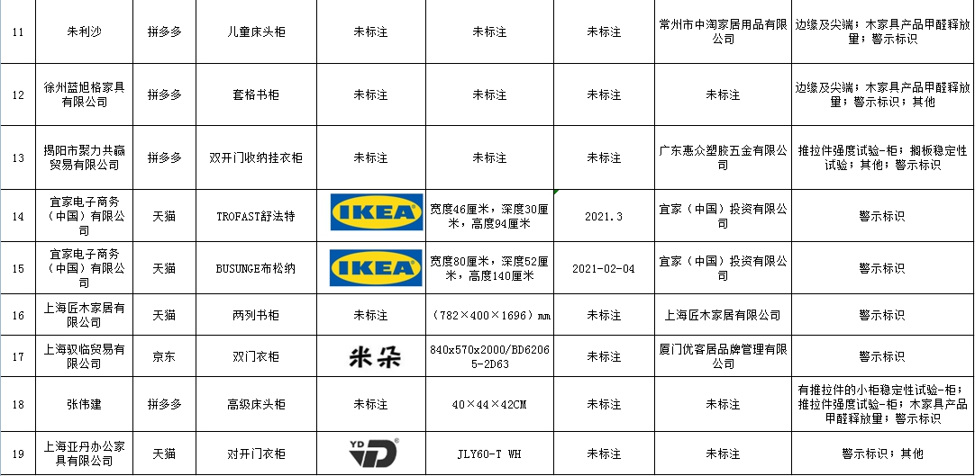 其中,不合格项目分别是木家具产品甲醛释放量、表面涂层可迁移元素、边缘及尖端、孔及间隙、稳定性试验、推拉件强度试验、推拉件防脱离试验、结构安全-其他和警示标识9项。