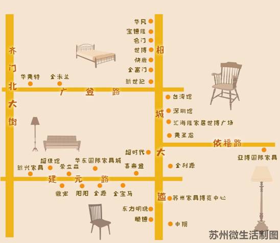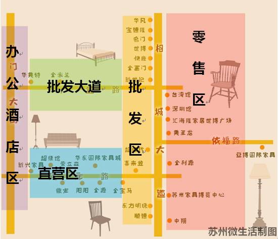 整个蠡口家具城主要是由相城大道,齐门北大街,建元路和广登路四条路组成。也是这四条路,划分出了5个不同的区域。