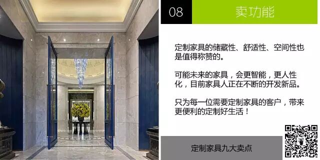 本节学习内容:定制家具九大卖点、定制家具七大优点、定制家具五大注意事项、定制家具四大软装魅力,一共4个部分。(培训教程版)