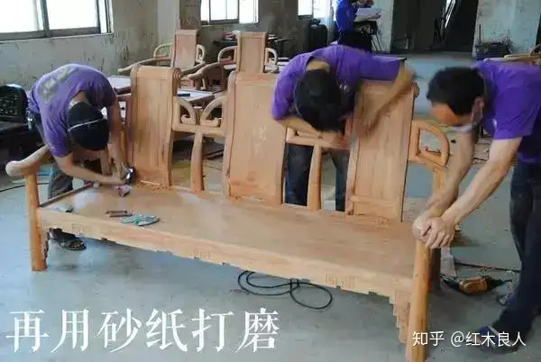 5、打磨:打磨使家具整体达到平滑,可以观察各部位是否 平整、光滑,有无波浪形、有无缺痕,对称部位是否对称,线条粗细是否均匀。