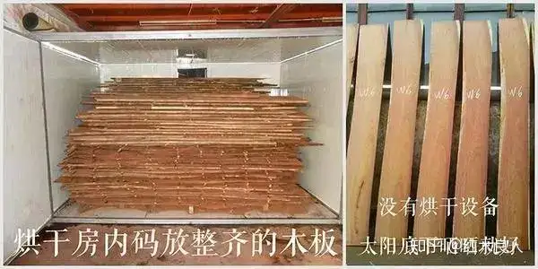 比较标准的烘干,必须要有专业可以控制湿度的烘干房,木材切片以后一块一块摆放整齐,连续15天烘干。