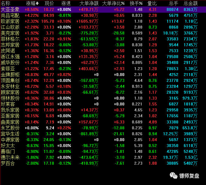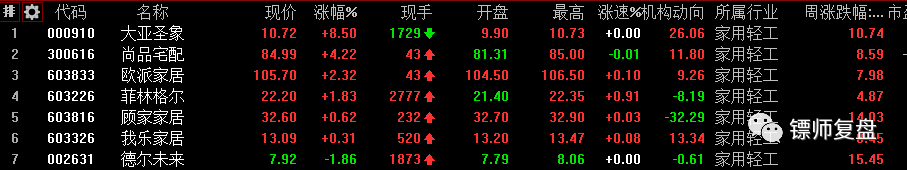 以上这7只家具板块个股目前短期趋势均出现了转好信号,并且近期出现了资金增量,市场资金有一部分进来开始参与了,该几只股票如果出现正常技术性调整的话,可能会出现较好的上车机会,后期镖师会跟踪这几只股票的每日走势情况。