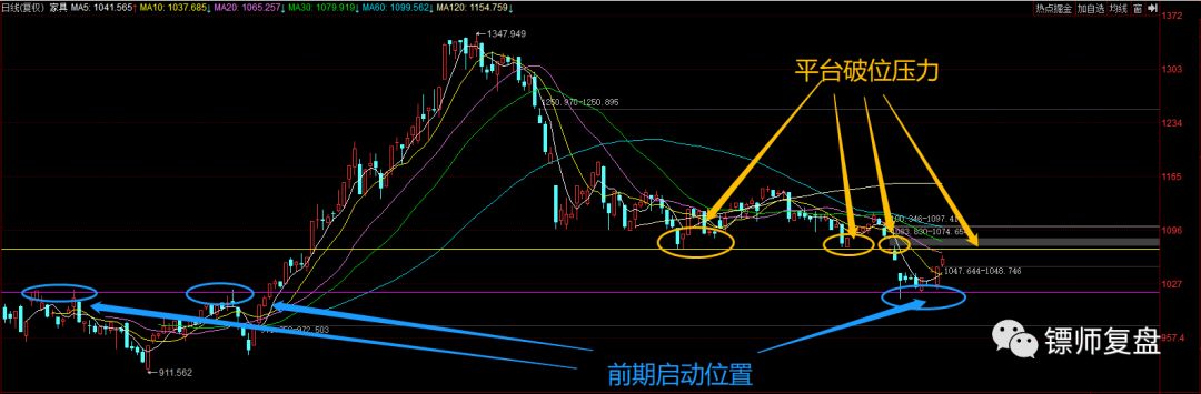 上图为家具板块走势图,图中我们看到在经过前期支撑平台破位后,目前位置处在前期启动平台中,预计会在启动平台与破位平台处走一个中期趋势的震荡盘整期。
