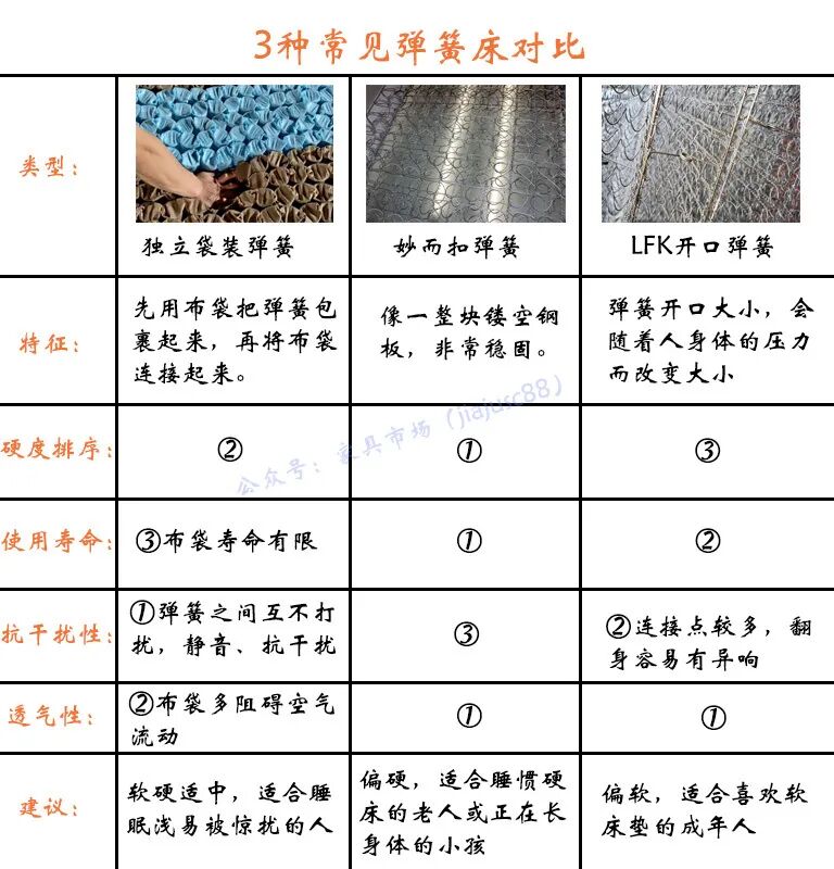 目前,市面上常见的弹簧床垫主要有独立袋装弹簧、妙而扣弹簧、LFK开口弹簧这三种,它们的主要区别如下图: