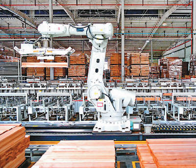 江西省赣州市南康区出台数字化转型奖励扶持政策,在技术攻坚、资金奖补、创新研发方面,激励引导家具生产企业利用数字化工具、工业互联网、产业大数据平台提升生产效率,降低生产综合成本,不断激发企业数字化转型发展潜能。图为在南康区的一家品牌木地板上市企业智能车间,码垛机械臂快速运转。