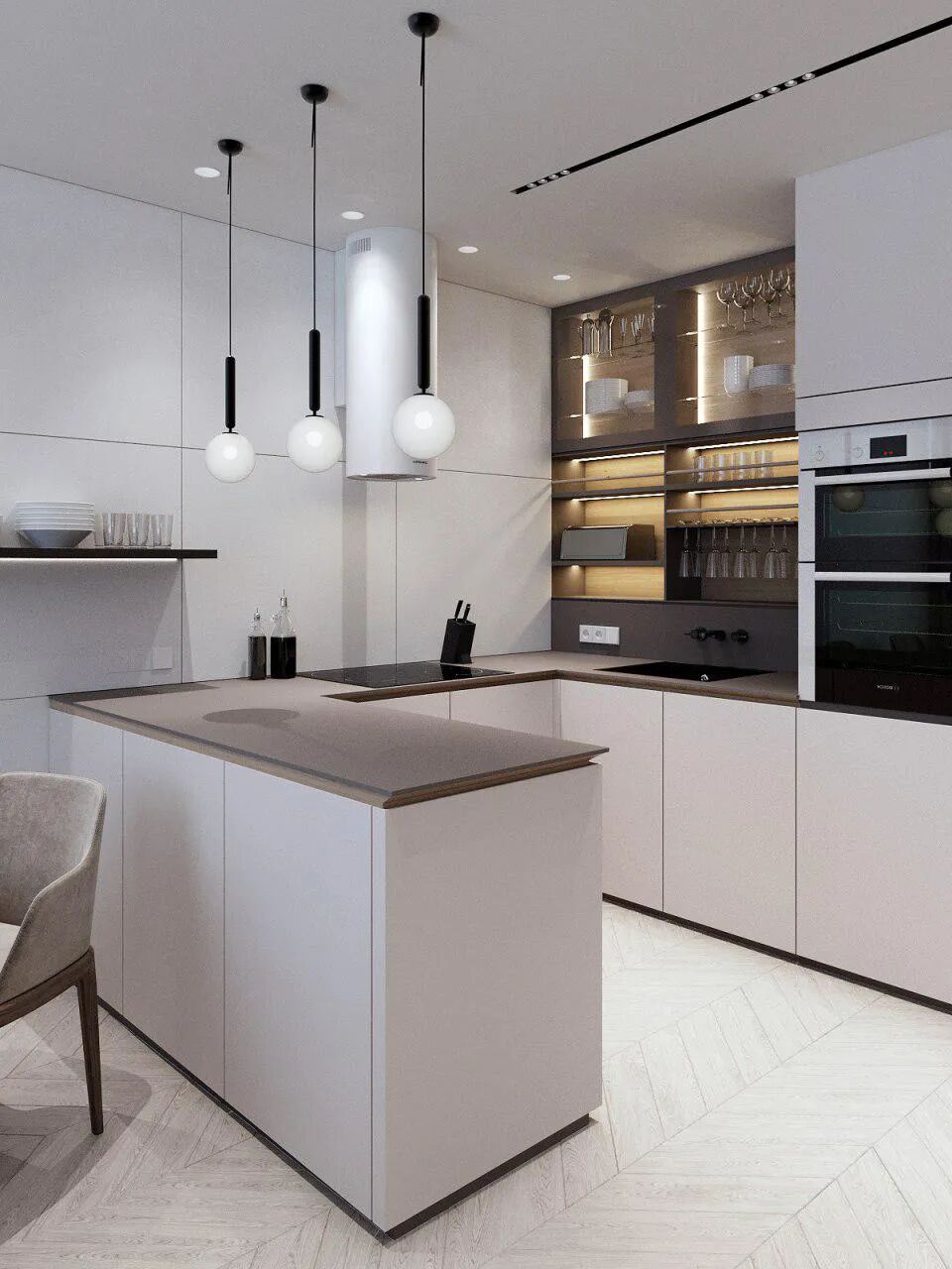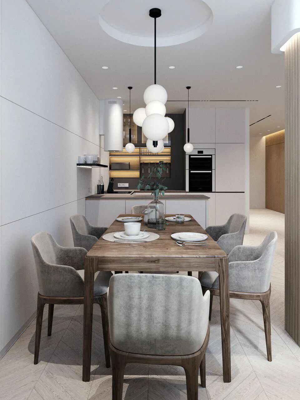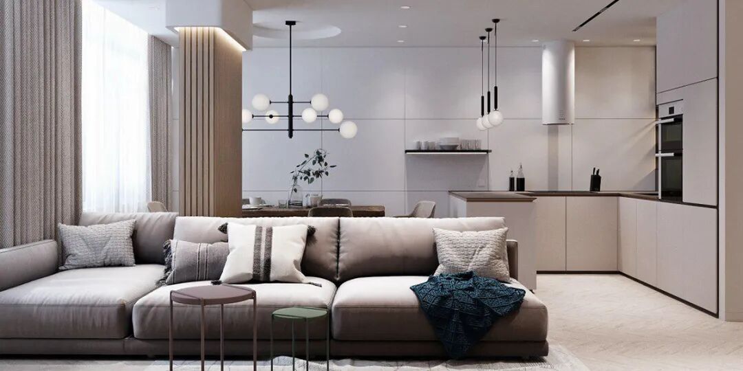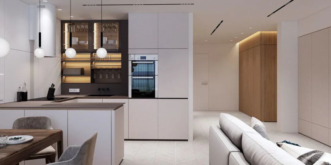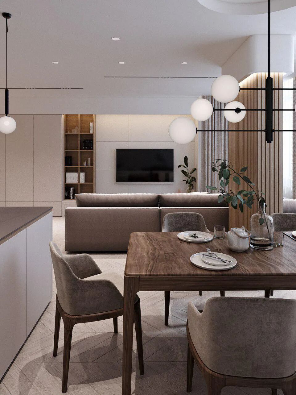 沙发背后是厨房和餐厅,延续了整体的简约优雅,白色球形吊灯优雅垂落于实木餐桌之上。餐厨空间紧密相连,理想中的美食有了更多的互动性和可能性,增加情感交流使空间更具有烟火气息。