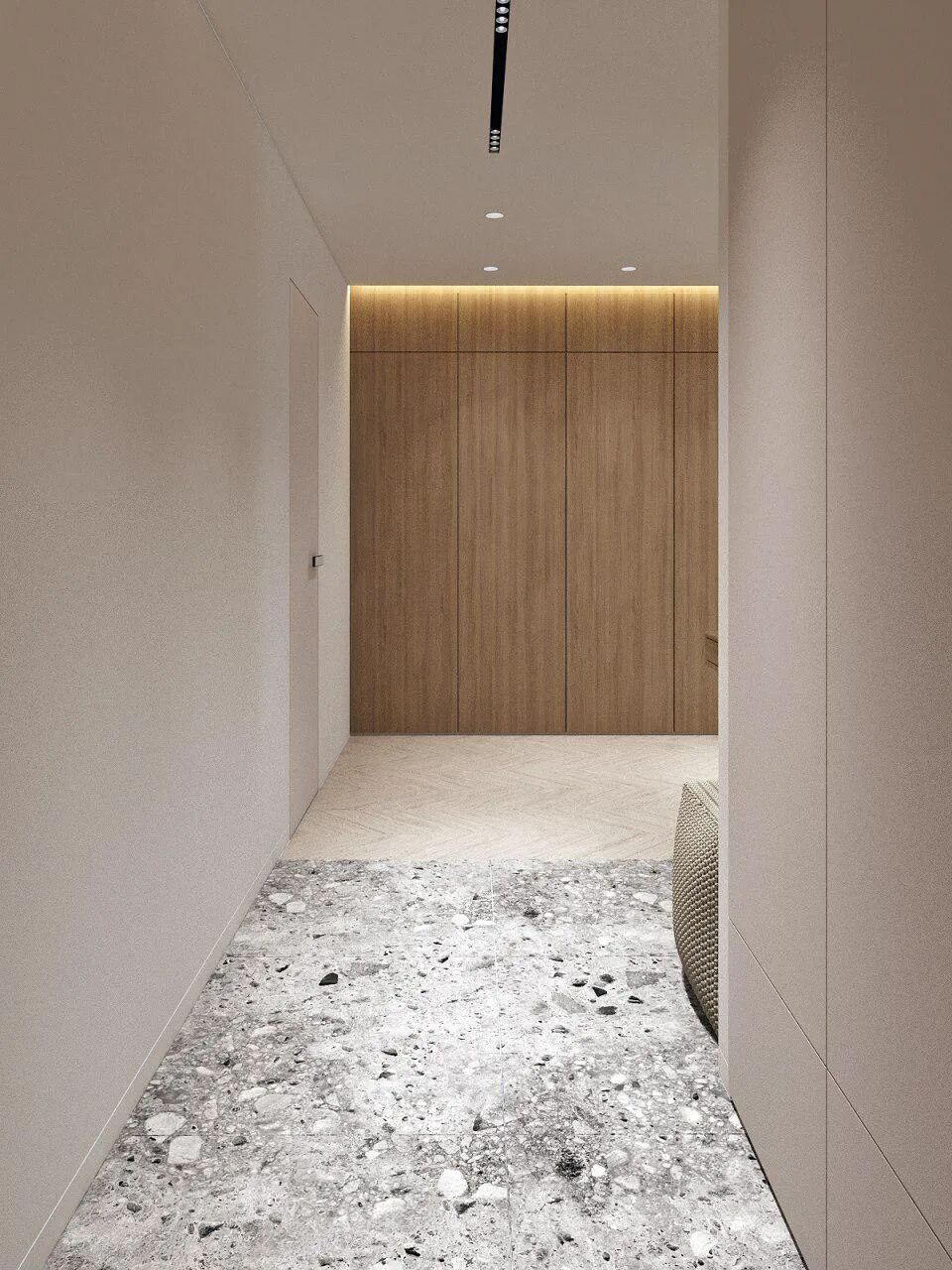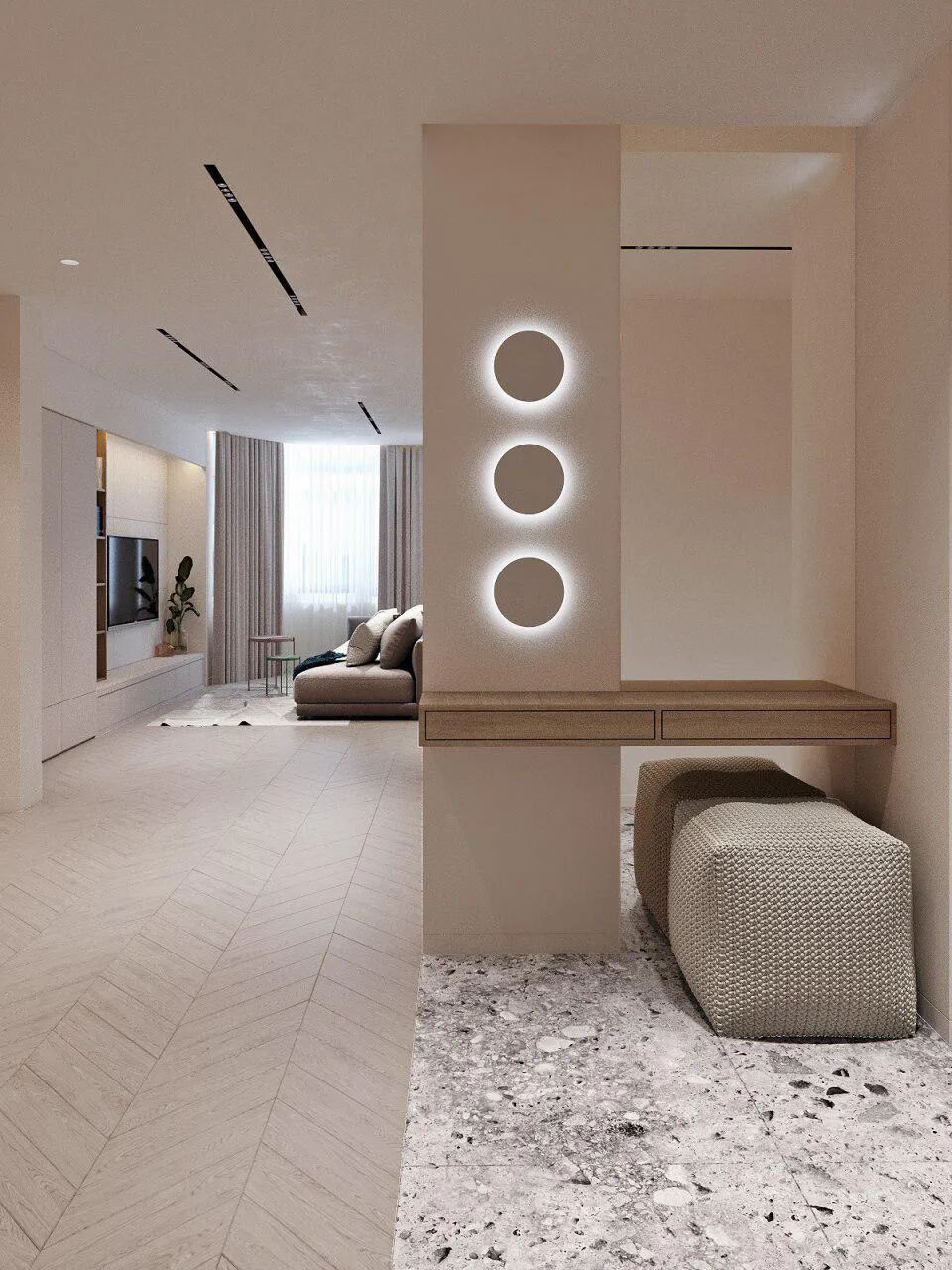 玄关入口温润木质与纯净白色系为基底,整体空间由白色调传递纯净气息,搭配温润木质元素,营造出静谧优雅的美学氛围。