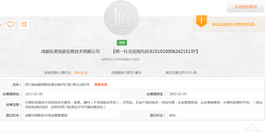 在成都工商局官网上查询该企业信息,发现成都乐美饰家信息技术有限公司已被列入经营异常名录,其子公司成都美乐乐贸易有限公司、成都美乐乐信息技术有限公司均显示经营异常,而其官网也无法打开。