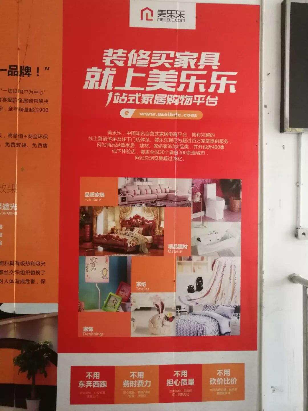 记者来到这里,三面外墙上都有着“美乐乐家居”醒目标识;通往二楼的每级楼梯上;也有“美乐乐家居”标识;楼梯间,走廊上,还有更多关于“美乐乐家居”的宣传语:“装修买家具,就上美乐乐”,“1站式家居购物平台”,“贴心服务,物流/送货/安装一步到位,不用费时费力”……