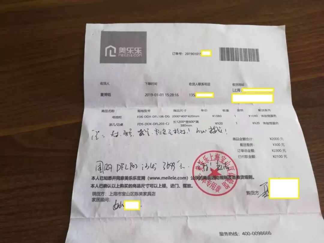 记者现场采访发现,已送到夏先生家里的茶几与电视柜都为中式风格,团购订单上的家具照片显示,沙发为木韵系列,与茶几和电视柜一样,都是中式风格。合同上盖的章为“美乐乐上海宝山区体验馆”,销货方为:宝山区陈美家具店。